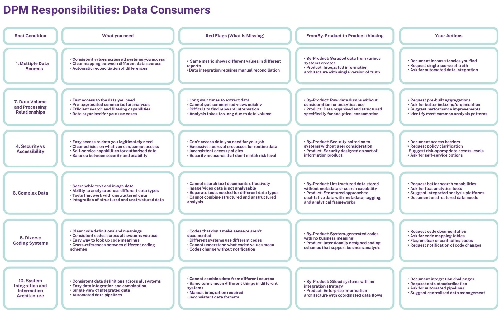 The Data Consumer responsibility framework serves as a systematic diagnostic and progression toolkit that enables the DPM to assess where consumers currently struggle (indicating current DRL level) and what must be addressed to enable progression toward DRL 7. This structured approach ensures that consumer needs are met systematically rather than through ad hoc firefighting.